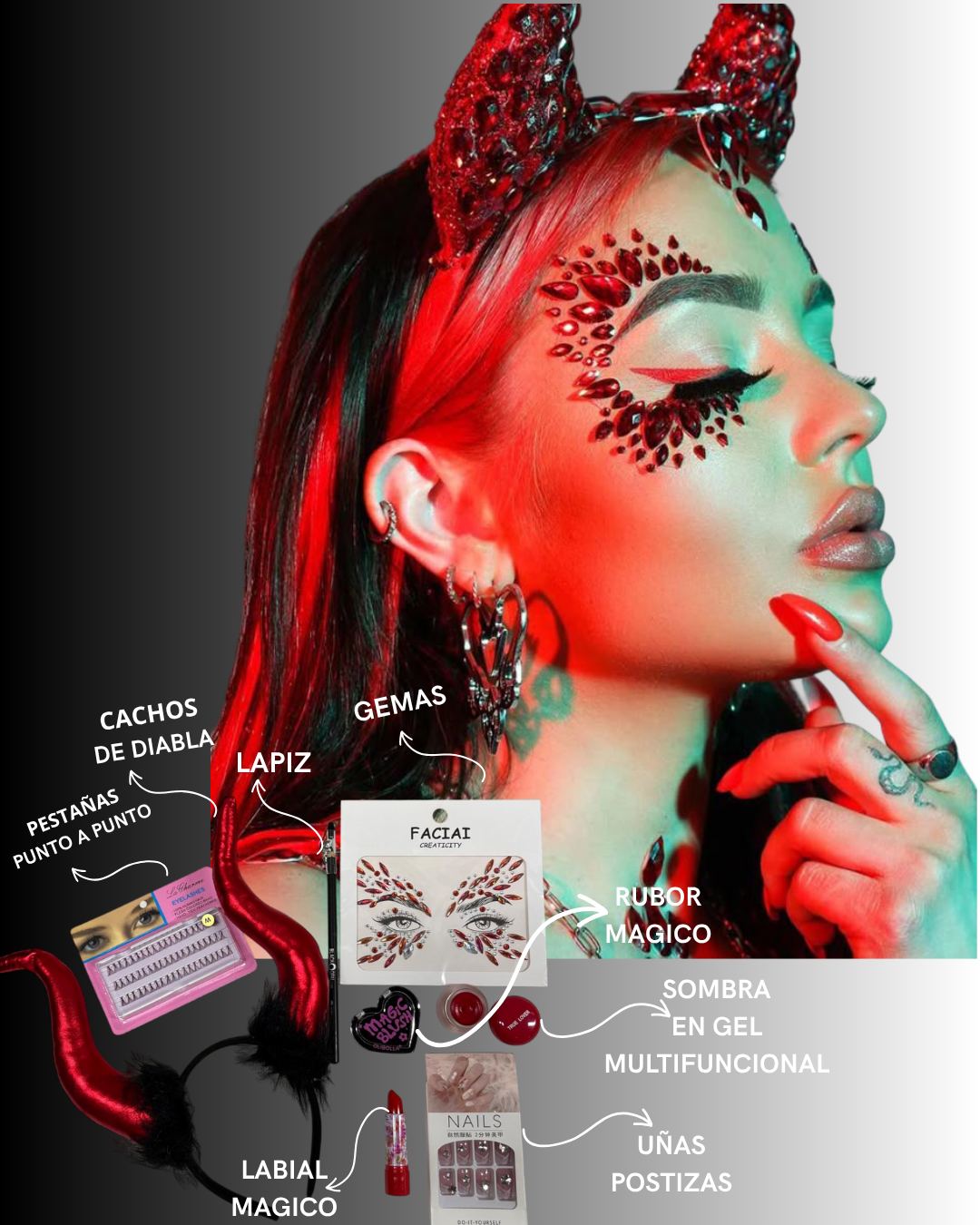 Enciende tu mirada con un toque de elegancia y misterio. Nuestro exclusivo Diabla Glam te ofrece todo lo necesario para recrear un maquillaje impactante y lleno de glamour: